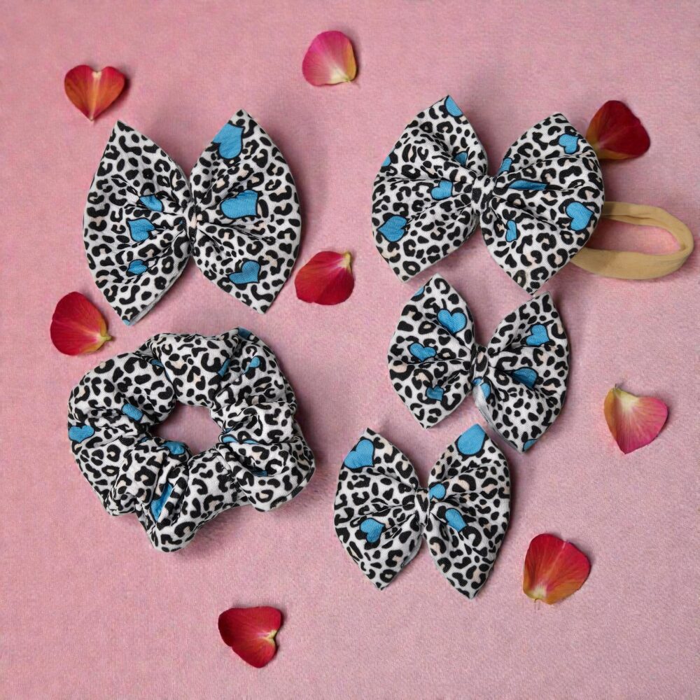 Leopard Blue Heart Hair Bow Set | Valentine Bow & Scrunchie Set for Babies, Toddlers & Girls